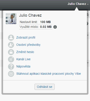 POZNÁMKA:Pokud pomocí postupu uvedeného v této části nepůjde změnit některé vaše osobní údaje (například přihlašovací heslo k portálu Vibe), je to pravděpodobně proto, že jsou tyto informace synchronizovány z nějakého externího adresářového serveru. V takovém případě se poraďte s administrátorem portálu Vibe.