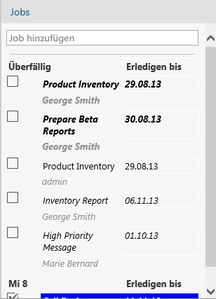 Ein Job ist eine Nachricht, die an einem bestimmten Datum und zu einer bestimmten Uhrzeit abgeschlossen werden muss. Wenn Sie einem Benutzer einen Job zuweisen, kann er diesen akzeptieren oder ablehnen. Solange er ihn noch nicht akzeptiert oder abgelehnt hat, wird der Job täglich im Joblistenordner und im Kalender des Benutzers angezeigt.