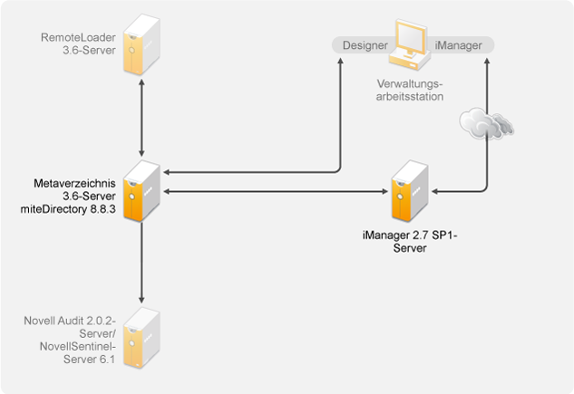 Für Identity Manager wird vorausgesetzt, dass eDirectory™ und iManager installiert sind. Auf diesen Produkten basiert Identity Manager. Abbildung 6-2 veranschaulicht diese Komponenten.