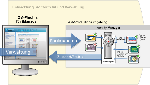Novell® iManager ist ein browserbasiertes Werkzeug, das einen einzelnen Administrationspunkt für viele Novell-Produkte, einschließlich Identity Manager, zur Verfügung stellt. Mithilfe der Identity Manager-Plugins für iManager können Sie Identity Manager verwalten und Echtzeitinformationen zum Zustand und Status Ihres Identity Manager-Systems erhalten.
