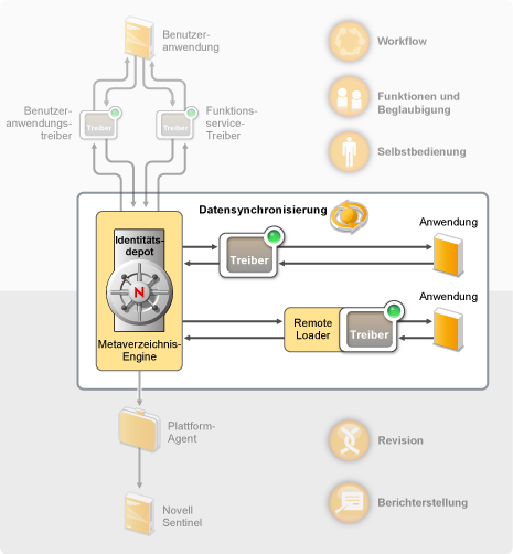 Die Datensynchronisierung wird einschließlich der Passwortsynchronisierung durch die fünf Basiskomponenten der Identity Manager-Lösung ermöglicht: das Identitätsdepot, die Metaverzeichnis-Engine, die Treiber, der Remote Loader und die verbundenen Anwendungen. Diese Komponenten sind im folgenden Diagramm abgebildet.