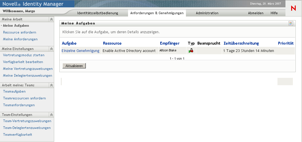 Standardmäßig wird nach Ihrer Anmeldung bei der Identity Manager-Benutzeroberfläche die Registerkarte mit der Seite „Meine Aufgaben“ angezeigt: