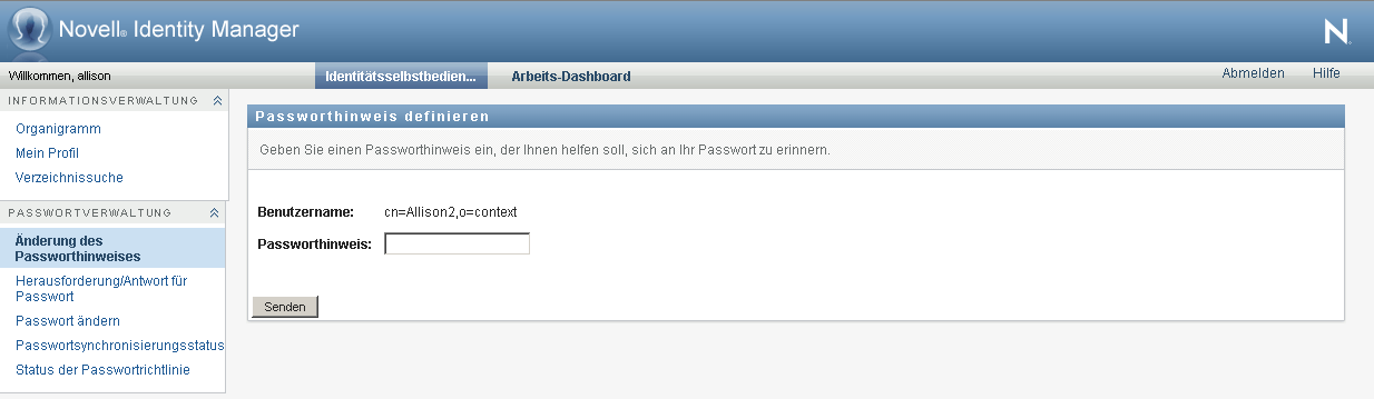 Ein Passworthinweis wird bei der Anmeldung verwendet und soll Ihnen helfen, sich an Ihr Passwort zu erinnern, wenn Sie dieses vergessen haben. Auf der Seite „Änderung des Passworthinweises“ können Sie Ihren Passworthinweis festlegen oder ändern.