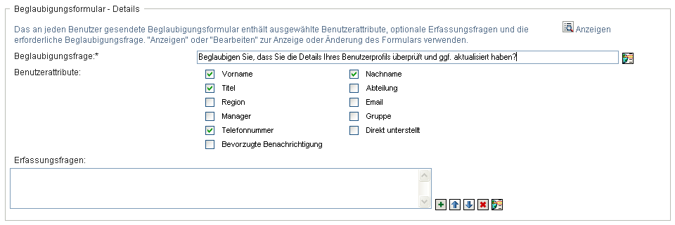 Im Feld können Sie optional eine oder mehrere Fragen hinzufügen, die ein Beglaubiger während der Ausführung eines Beglaubigungsprozesses beantworten kann. Erfassungsfragen sind für einen Beglaubigungsprozess nicht erforderlich. Wenn der Prozess jedoch Erfassungsfragen enthält, können diese optional vom Beglaubiger beantwortet werden.