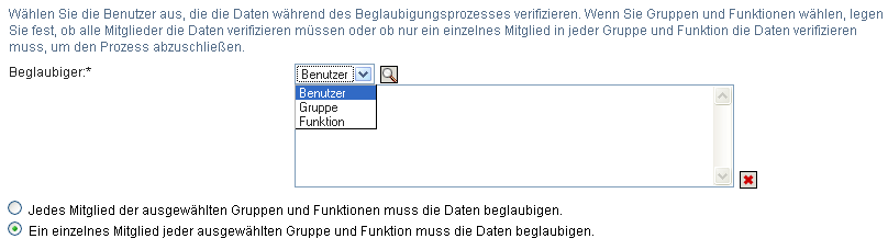 Geben Sie für Gruppen- und Rollenbeglaubiger an, ob die Daten von allen Mitgliedern oder nur von einem Mitglied aus jeder Gruppe und Rolle bestätigt werden müssen, indem Sie eine der folgenden Schaltflächen auswählen: