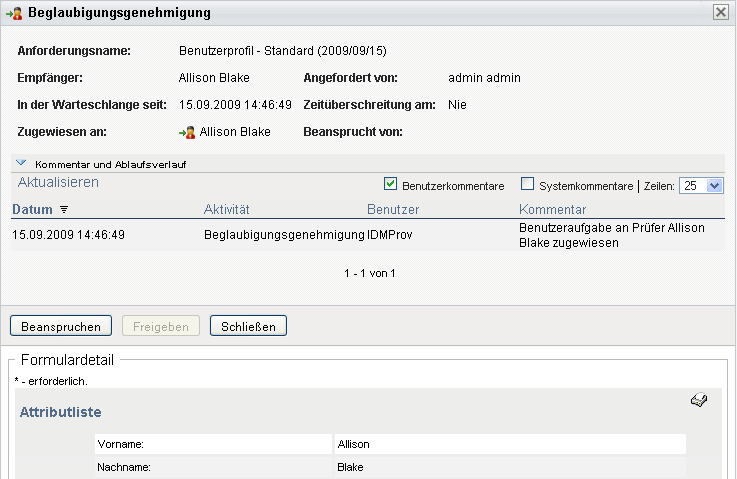 Im daraufhin eingeblendeten Fenster können Sie Benutzer- und Systemkommentare sehen. Die Reihenfolge der angezeigten Kommentare hängt von dem mit jedem Kommentar verknüpften Zeitstempel ab. Die ältesten Kommentare werden zuerst angezeigt. Bei parallel stattfindenden Genehmigungs-Workflows kann die Reihenfolge der gleichzeitig verarbeiteten Aktivitäten unvorhersehbar sein.