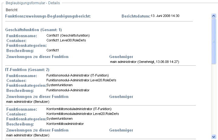 Bei Prozessen zur Rollenzuweisungs-, Benutzerzuweisungs- und SoD-Beglaubigung enthält das Formular einen Bericht, in dem die zu prüfenden Daten angezeigt werden: