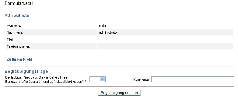 Bei Beglaubigungsanforderungen wird der Abschnitt der Seite um das Beglaubigungsformular erweitert. Die Darstellung des Formulars variiert je nach Beglaubigungstyp. Bei Prozessen für die Benutzerprofilbeglaubigung zeigt das Benutzerprofil die zu prüfenden Daten an: