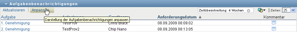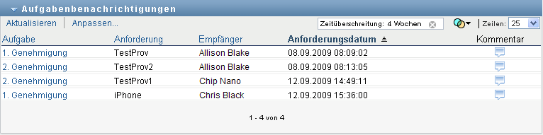 Bei Ressourcen- und Rollenanforderungen gibt die Spalte in der Aufgabenliste die Benutzer oder Gruppen an, die die Ressource bzw. Rolle erhalten, wenn die erforderlichen Genehmigungen erteilt werden. Für Beglaubigungsanforderungen gibt die Spalte den Namen des Beglaubigers an.