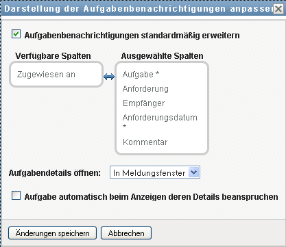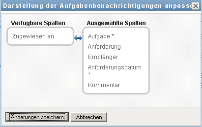 Im Abschnitt „Aufgabenbenachrichtigungen“ der Seite „Arbeits-Dashboard“ können Sie Spalten auswählen bzw. deren Auswahl aufheben sowie die Reihenfolge der Spalten innerhalb der Anzeige der Aufgabenliste ändern. Dieses Verhalten wird durch eine Einstellung im Dialogfeld „Darstellung der Aufgabenbenachrichtigungen anpassen“ gesteuert.