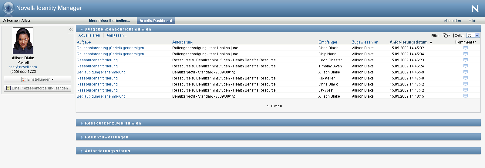 Mithilfe der Aktion können Sie mit Ressourcen-, Rollen-, Prozess- und Beglaubigungsanforderungen verknüpfte Aufgaben bearbeiten. Die Benutzeroberfläche kann sich je nach bearbeiteter Aufgabe unterscheiden. Für Beglaubigungsanforderungen zeigt die Aktion nur diejenigen Aufgaben an, für die der aktuelle Benutzer als Beglaubiger festgelegt wurde.