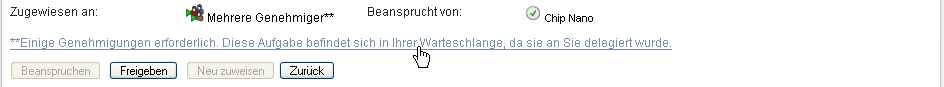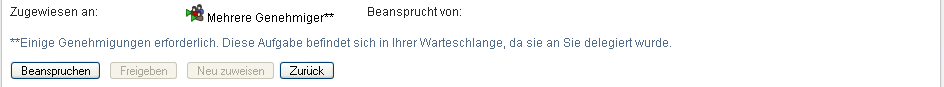 Wenn der Genehmigungstyp Mehrere Genehmiger lautet, wurde die Aufgabe mehreren Adressaten zugewiesen und muss von allen Adressaten beansprucht und genehmigt werden.