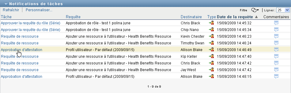 Wenn im Steuerelement ein Benutzer ausgewählt ist, zeigt die Liste Aufgaben an, für die der ausgewählte Benutzer der Adressat oder der Empfänger ist. Der Bereitstellungsadministrator oder Bereitstellungsmanager kann die Aufgabenliste filtern, sodass nur diejenigen Aufgaben angezeigt werden, für die der verwaltete Benutzer der Adressat ist. Alternativ kann der Benutzer die Liste filtern, sodass nur diejenigen Aufgaben angezeigt werden, für die der verwaltete Benutzer der Empfänger ist.