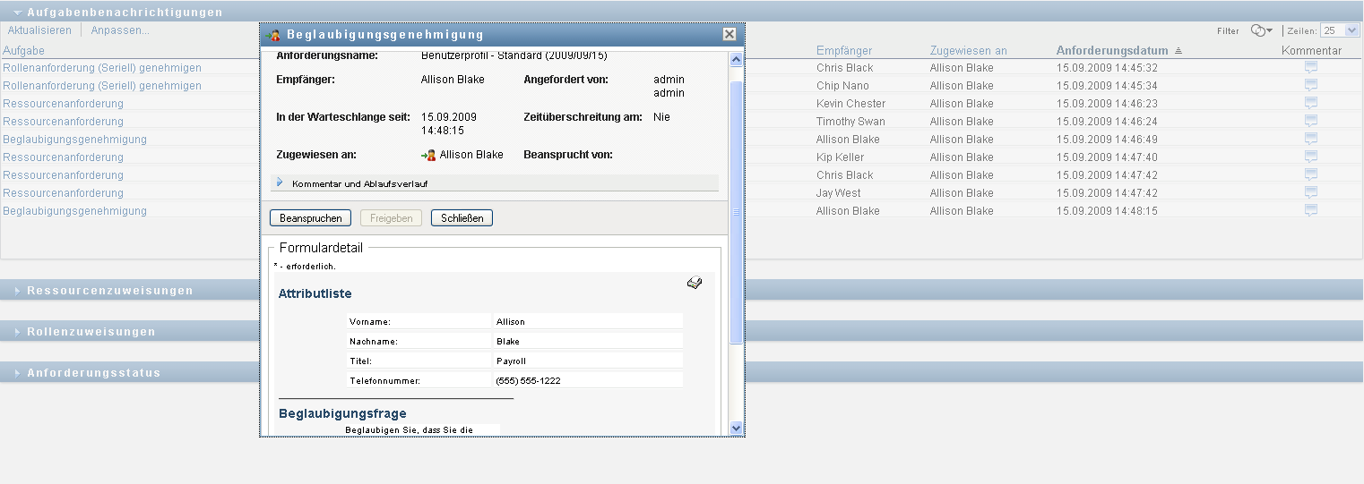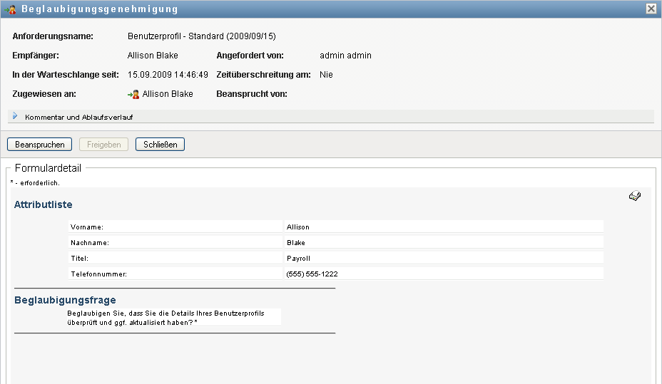 Wenn Sie eine Aufgabe beanspruchen, die mit einer Beglaubigungsanforderung verknüpft ist, müssen Sie die Informationen durchlesen, die im Beglaubigungsformular angezeigt werden. Zusätzlich müssen Sie die erforderliche Beglaubigungsfrage beantworten, wodurch Sie bestätigen, dass die Daten richtig sind. In einigen Fällen müssen auch eine oder mehrere Erfassungsfragen beantwortet werden. Bei Prozessen für die Benutzerprofilbeglaubigung umfasst das Formular die Benutzerattributdaten, die Sie auf ihre Richtigkeit hin überprüfen müssen. Bei Prozessen zur Rollenzuweisung, Benutzerzuweisung und Funktionstrennungsbeglaubigung enthält das Formular einen Bericht, in dem die zu prüfenden Rollenzuweisungs-, Benutzerzuweisungs- bzw. Funktionstrennungsdaten angezeigt werden.