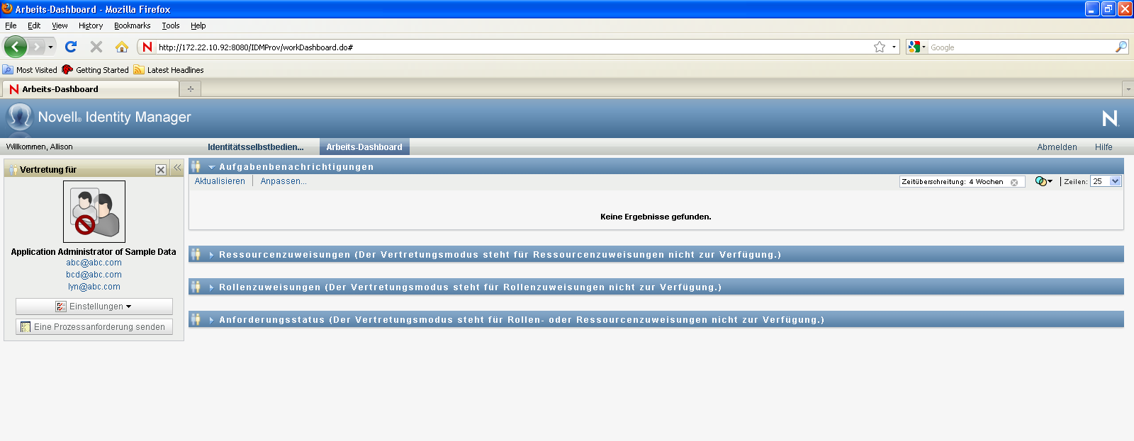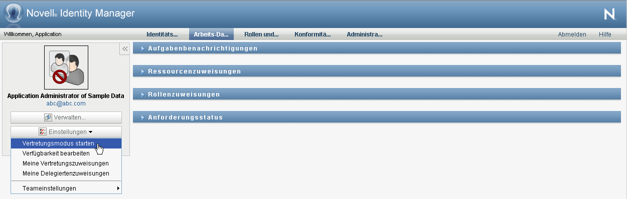 Nun können Sie alle Aktionen ausführen, zu denen auch der Benutzer, den Sie vertreten, berechtigt ist. Die verfügbaren Aktionen variieren je nach Ihren Berechtigungen und den Berechtigungen des Benutzers, den Sie vertreten.