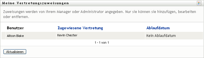 Wenn Sie kein Bereitstellungsadministrator, Bereitstellungsmanager oder Team-Manager sind, wird Ihnen eine schreibgeschützte Ansicht Ihrer Vertretungszuweisungen angezeigt: