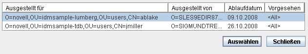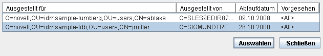 Das Applet blendet daraufhin ein Fenster ein, in dem Sie ein Zertifikat auswählen können. In dem Fenster werden Zertifikate aufgeführt, die in den Browser importiert wurden, sowie Zertifikate, die auf die Smartcard (sofern aktuell verbunden) importiert wurden.
