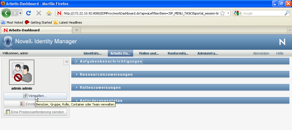 Das Arbeits-Dashboard zeigt das Fenster „Verwalten“ an: