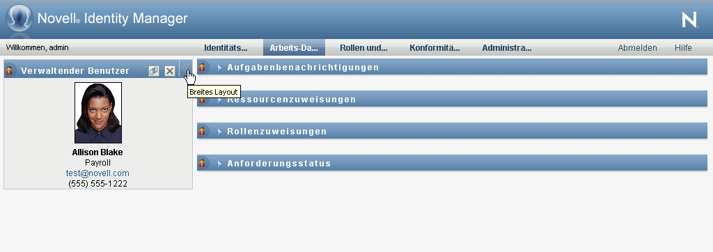 Die Details zur aktuell ausgewählten Entität werden ausgeblendet, sodass Ihnen mehr Platz zum Arbeiten mit den Abschnitten „Aufgabenbenachrichtigungen“, „Ressourcenzuweisungen“, „Rollenzuweisungen“ und „Anforderungsstatus“ der Seite zur Verfügung steht.