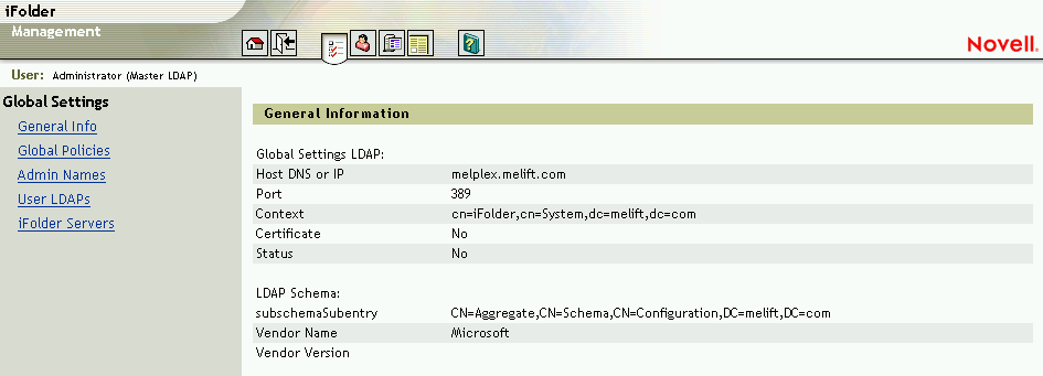 Durch die Schemaerweiterung und die soeben erstellten Objekte kann der iFolder-Server mit den LDAP-Einstellungen betrieben werden, die Sie während der Installation angegeben haben. Diese Einstellungen werden als globale LDAP-Einstellungen verwendet. Weitere Informationen finden Sie unter LDAP-Verzeichnisse .