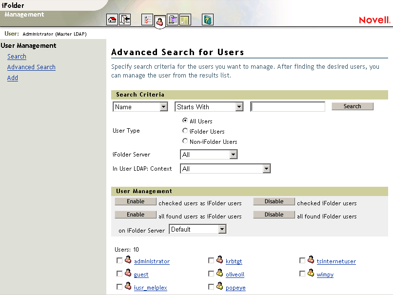 Suchen Sie mit "Advanced Search" (Erweiterte Suche) nach allen Benutzern auf dem Server, auf dem soeben iFolder installiert wurde. Geben Sie dabei den entsprechenden Benutzer-LDAP-Kontext an.