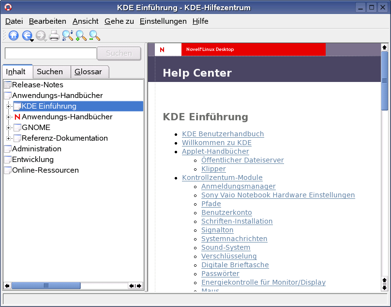 Wenn Sie das Hilfezentrum starten (durch Klicken auf "Hilfe" > "Benutzerhandbuch" im Panel oder durch Klicken auf "Hilfe" in einer Anwendung), erscheint die Ansicht wie unter Hauptfenster des Hilfezentrums dargestellt. Dieses Fenster enthält drei Hauptbereiche:
