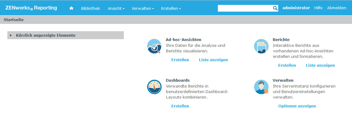 Die angegebene Benutzer-ID wird intern beim LDAP-Server authentifiziert. Nach erfolgter Autorisierung beim LDAP-Server können Sie sich bei der Anwendung anmelden. Anschließend wird die ZENworks Reporting-Startseite geöffnet.