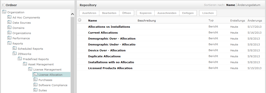 Das Repository ist der interne Speicher für Berichte, Analyseansichten und zugehörige Dateien des Servers. Das Repository ist in Ordner mit Ressourcen (z. B. Dateisysteme) gegliedert. Im Gegensatz zu einem Dateisystem wird das Repository allerdings als private Datenbank gespeichert, auf das nur ZENworks Reporting direkt zugreifen kann.