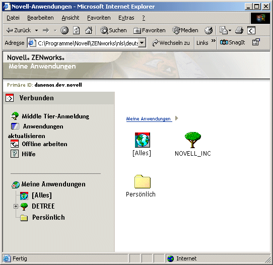 eDirectory-Bäume: Jeder Baum enthält die Anwendungen, die darin gespeichert sind und an den Benutzer oder die Arbeitsstation verteilt wurden. Application Launcher zeigt nur Bäume an, bei denen sich der Benutzer beglaubigt hat.