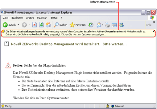 HINWEIS:Die Anzeige der Informationsleiste ist standardmäßig aktiviert, der Benutzer kann jedoch die Standardeinstellung ändern, sodass die Informationsleiste nicht angezeigt wird. Ferner werden die ActiveX-Steuerelemente bei ausgeblendeter Informationsleiste automatisch installiert, wenn der Herausgeber des Steuerelements (beispielsweise Novell) vom Benutzer zuvor als vertraut gekennzeichnet wurde.