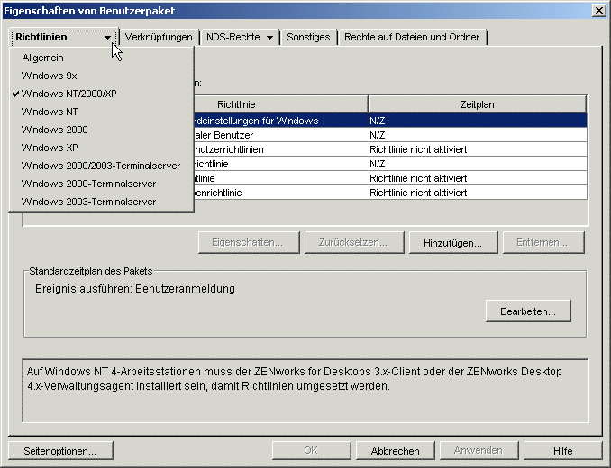 2 Da Terminalserver von früheren ZENworks-Versionen nicht unterstützt wurden, werden auf dieser Seite festgelegte Richtlinien nur auf Arbeitsstationen angewandt, die auf ZENworks for Desktops 4 oder höher aktualisiert wurden.
