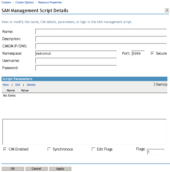 Used for CIM (Common Information Model) and SMI-S (Storage Management Initiative Specification) enabled scripts that manage a physical SAN. These are not used for the dynamic DNS script. Deselect the check box. After this check box is deselected, the CIMON IP/DNS, Namespace, Port, Secure, Username, and Password controls are all disabled. |