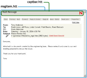 The Mail Message Window appears when the user double-clicks on one of the incoming or outgoing messages. It includes the captbar.inc file.