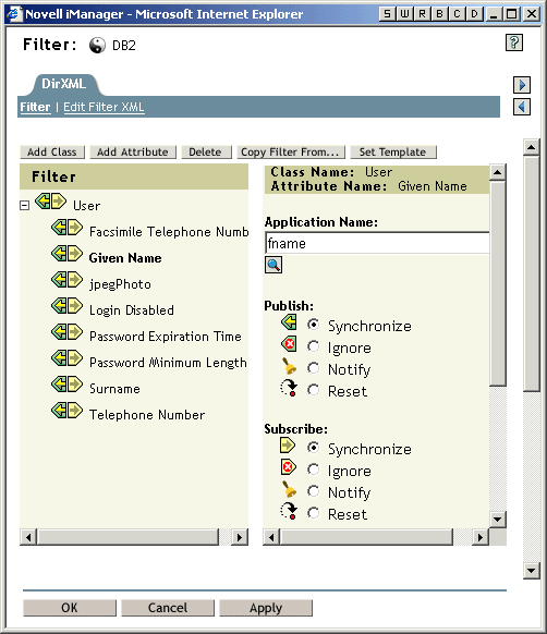 - The Filter interface provides a shortcut for schema mapping of attributes. The preceding figure shows an example. The Application Name field lets you specify what the attribute should be mapped to, and a browse button is provided for browsing the schema of the connected system if it is available.