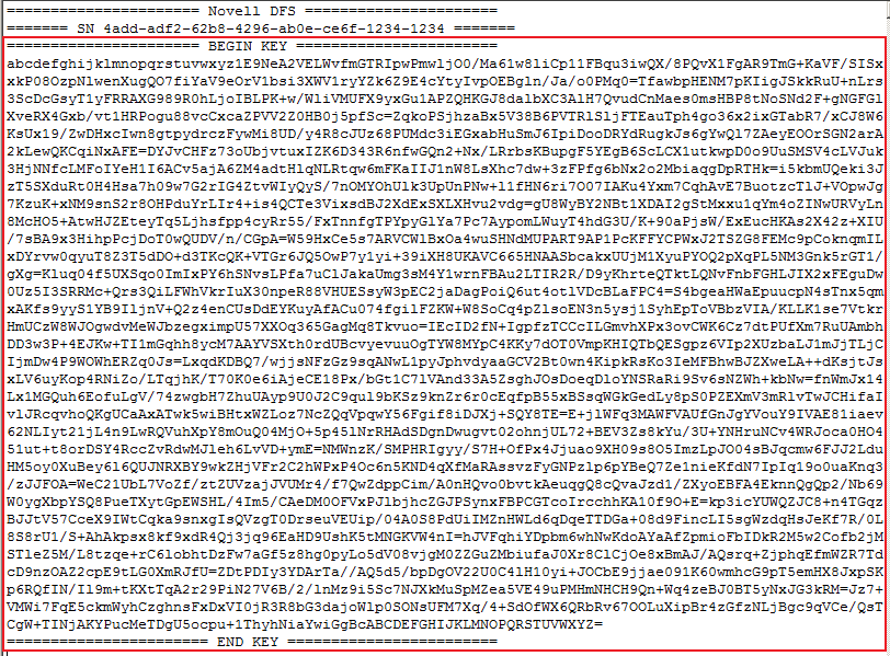 The file contains the serial number (the GUID in the file name) and the complete key code. The complete key code includes the series of equal signs that precede the Begin Key label to the end of the series of equal signs that follow the End Key label.