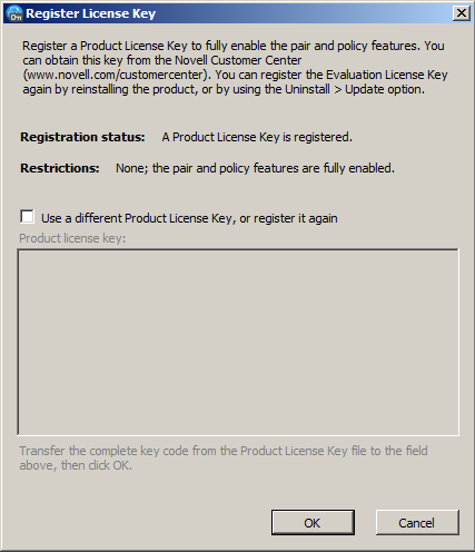If a license key is already registered on the server, the information on the page states This product is already registered. Continue only if you want to use a different license key or to re-register a key.