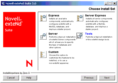 To run the Novell exteNd product suite installation programusing the Tools option: