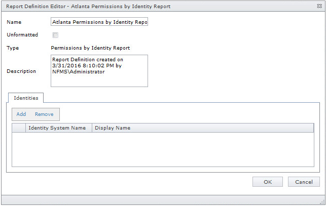 The Permissions by Identity report indicates the effective rights to the Micro Focus (formerly Novell) file system or the permissions to the Microsoft file system according to the identities you specify.