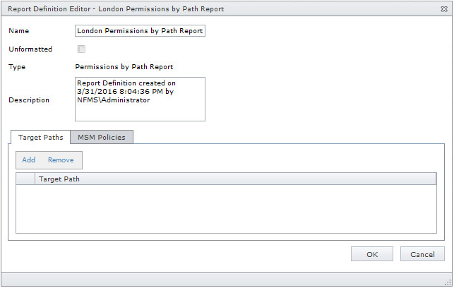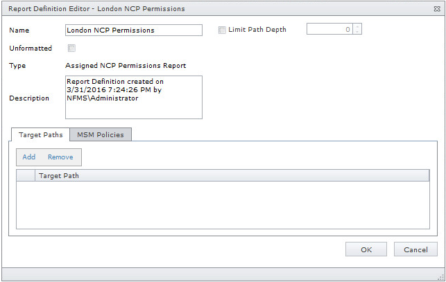 The Permissions by Path report indicates the effective rights to the Micro Focus (formerly Novell) file system or the permissions to the Microsoft file system according to the paths you specify.