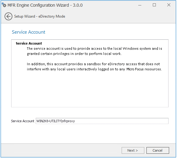 If you are upgrading from a previous version of File Reporter, the Proxy Account and Proxy Rights Group fields will specify the existing proxy account and proxy rights group such as nfrproxy and nfrproxyrights respectively.