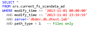 This example selects all files on the specific server from November 1, 2013 midnight, through November 2, 2013 11:59 PM.
