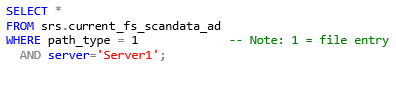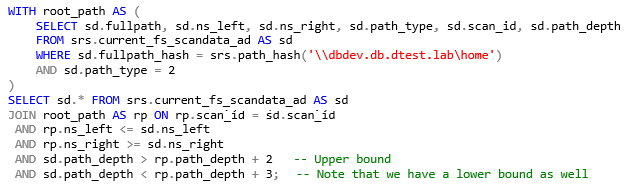 In this example, we are using two SELECT statements: one to get the information for the desired root path, and one to pull all subordinate entries along with the root path. Notice how the JOIN filter in the second SELECT statement uses not only the scan_id to limit the particular scan(s) of interest, but also uses the ns_left and ns_right fields to keep the data set limited to file entries in the folder hierarchy.