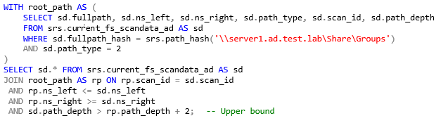 The selected path could be \\Server\Share\Groups and the path_depth could be assigned to the root_path + 2 or greater, as in the SELECT statement above.