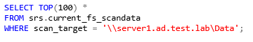 Example: Select file system data from a particular scan target (share or volume) limited to 100 entries.