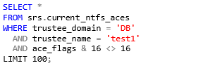 Example: Select all folders where a user is a direct trustee (not inherited) for NTFS, limited to 100 entries.