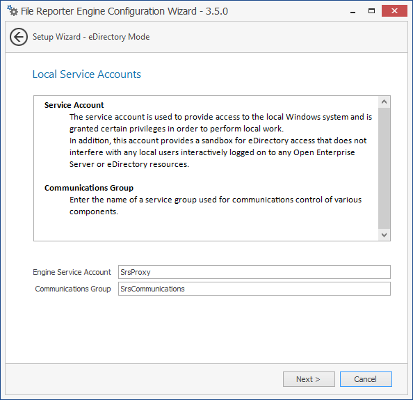 If you are upgrading from a previous version of File Reporter, the Proxy Account and Proxy Rights Group fields will specify the existing proxy account and proxy rights group such as nfrproxy and nfrproxyrights respectively.