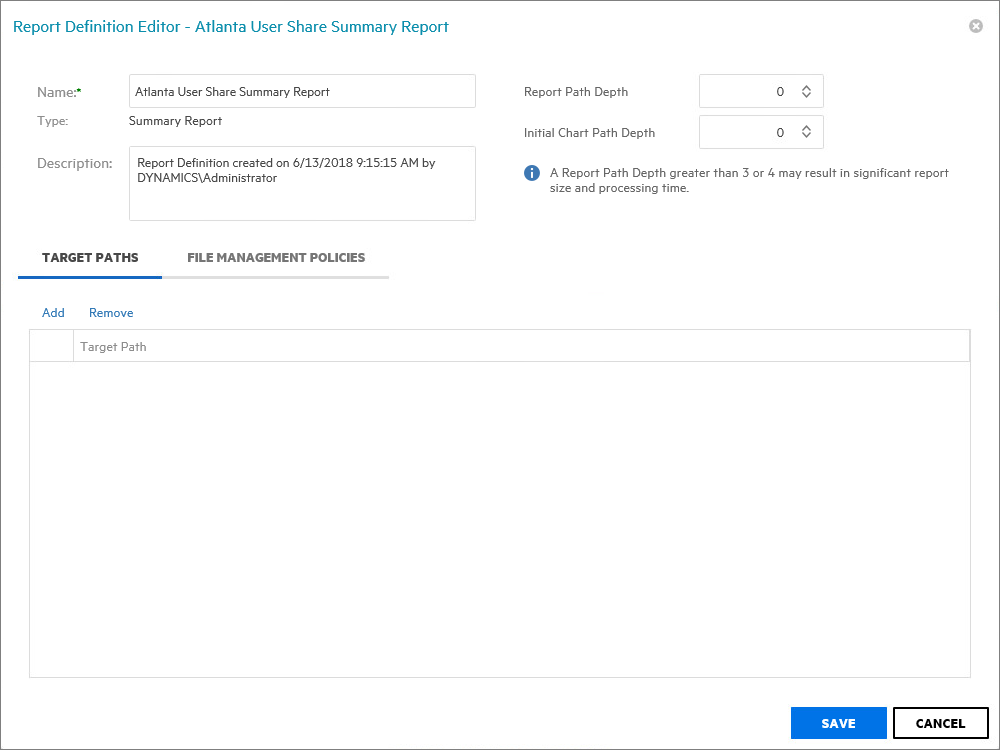 In the Initial Chart Path Depth field, specify the initial path depth for inclusion in the Top Ten Folders by Size chart that is displayed in the report header section.