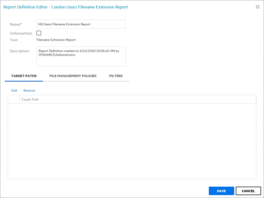 From the Target Paths tab, click Add, then browse to and specify the file paths you want included in the report and click OK.