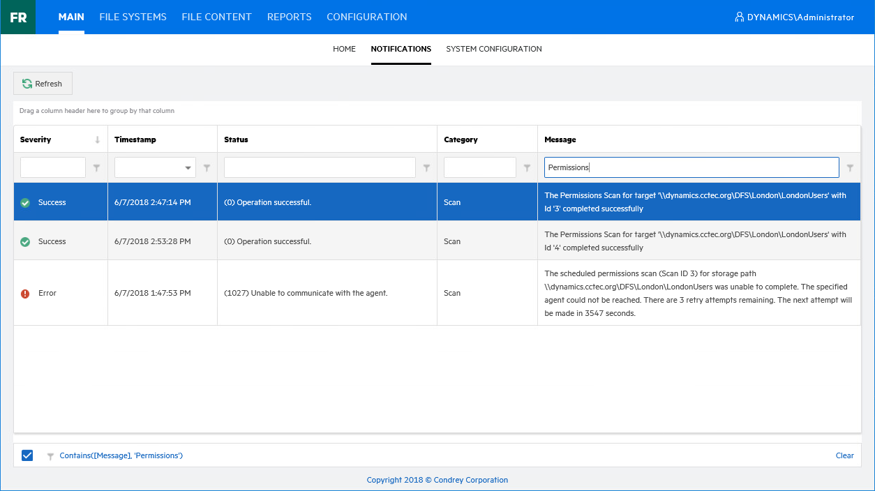 File Reporter displays notifications for successfully completed scans, failed scans, completed reports, failed reports, errors, warnings, and other information. You can use the filtering options to list only the notification types you want.