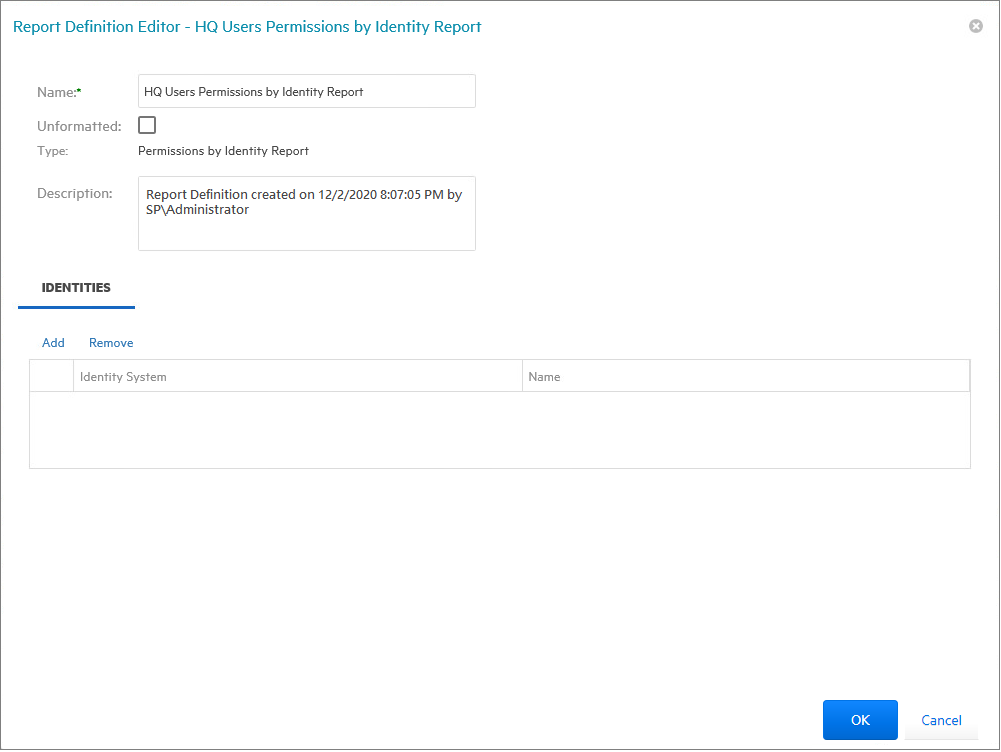 Browse to and specify the identities you want included in the report.